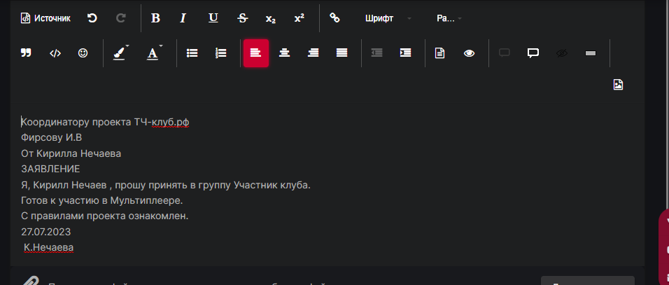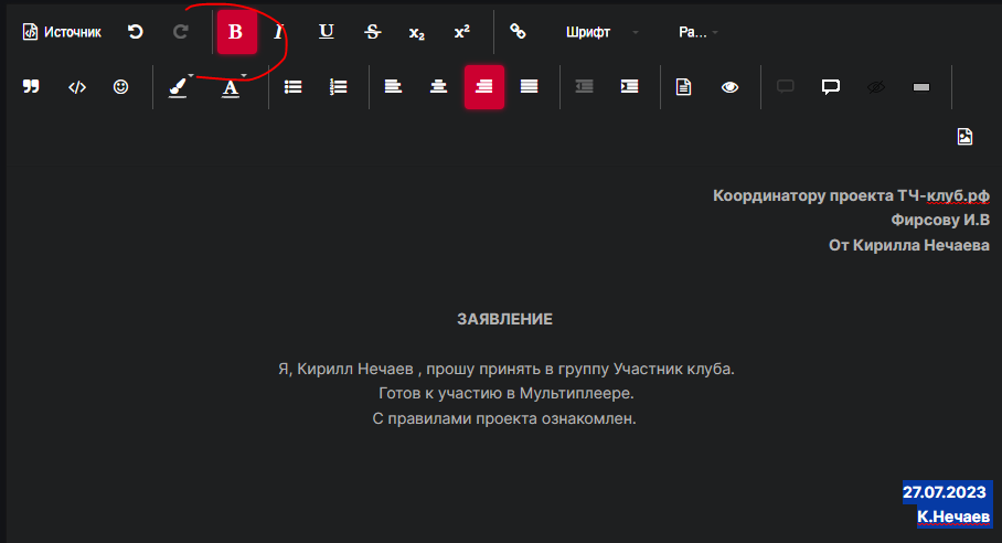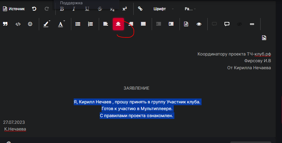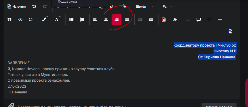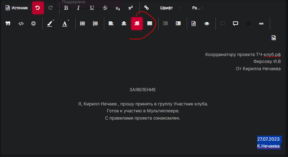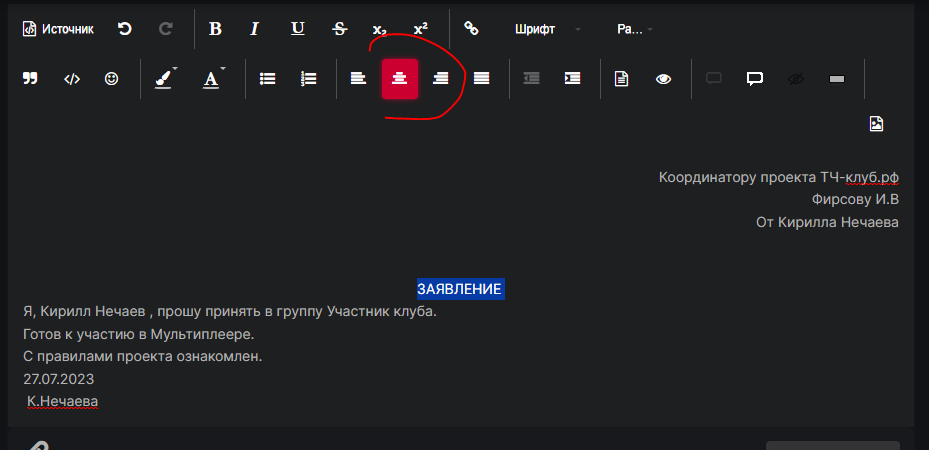 1. Пишем текст по левому краю 2. Равняем по правому краю 3. Равняем по центру 4. Равняем по правому краю 5. Выделяем жирным текст ( кому, заявление, от кого )