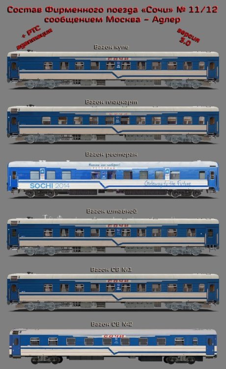 Состав фирменного поезда № 103/104 «Московия» сообщением Москва-Адлер Авторы: * Виктор Михайлов aka awaken, Федюнин Александр aka -–RZD-- - авторы модели * Виктор Михайлов aka awaken, Федюнин Александр aka -–RZD-- - авторы текстур * Виктор Михайлов aka awaken, Алексей Алпатов aka Aleks, Федюнин Александр aka –-RZD-- – авторы технических настроек * Михаил Кузнецов aka Mlazy – автор перекраски * Кузнецов Михаил aka mlazy – автор фотоматериала * Максим Рязанов aka Limburg 55 – автор фотоматериала В пакет входят: - Пассажирский плацкартный вагон № 1 производства ТВЗ 54 места - Пассажирский штабной вагон марки ТВЗ3 - Вагон ресторан - Пассажирский купейный вагон производства ТВЗ 36 мест - Пассажирский вагон СВ производства ТВЗ 18 мест [Hidden Content]