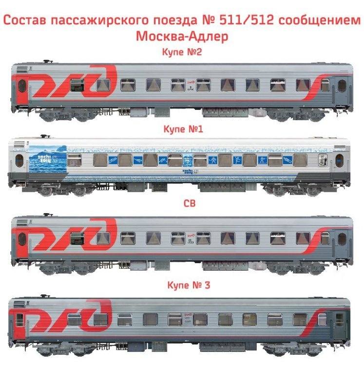 Состав пассажирского поезда № 511/512 сообщением Москва-Адлер Авторы: * Виктор Михайлов aka awaken, Федюнин Александр aka -–RZD-- - авторы модели * Виктор Михайлов aka awaken, Федюнин Александр aka -–RZD-- - авторы текстур * Виктор Михайлов aka awaken, Алексей Алпатов aka Aleks, Федюнин Александр aka –-RZD-- – авторы технических настроек * Кузнецов Михаил aka mlazy – автор перекраски * Рязанов Максим aka limburg55 – автор фотоматериала В пакет входят: - Пассажирский вагон купе № 2 ТВЗ 36 мест - Пассажирский вагон СВ ТВЗ 18 мест - Пассажирский вагон купе № 1 - Пассажирский вагон купе № 3 [Hidden Content]