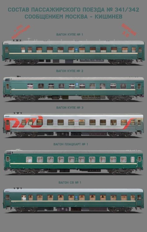 Состав пассажирского поезда №341/342 сообщением Москва-Кишинев Авторы: * Виктор Михайлов aka awaken, Федюнин Александр aka -–RZD-- - авторы модели * Виктор Михайлов aka awaken, Федюнин Александр aka -–RZD-- - авторы текстур * Виктор Михайлов aka awaken, Алексей Алпатов aka Aleks, Федюнин Александр aka –-RZD-- – авторы технических настроек * Михаил Кузнецов aka Mlazy – автор перекраски * Роман Бирюков aka Ромыч РЖДУЗ – автор фотоматериала * Игорь Дуванов aka NMSK – автор адаптации под РТС В пакет входят: - Пассажирский купейный вагон производства ТВЗ № 1 - Пассажирский купейный (штабной) вагон производства амендорф № 2 - Пассажирский СВ вагон производства амендорф № 1 - Пассажирский плацкартный вагон ДВЗ № 1 - вагон купе аммендорф 36 мест № 3 [Hidden Content]