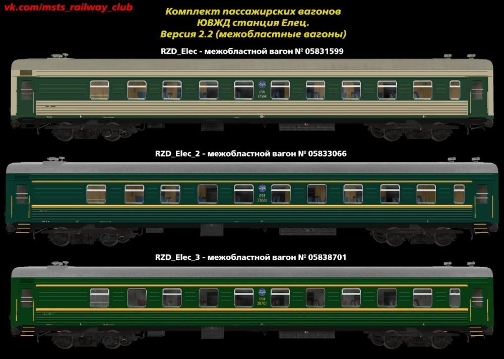 Комплект пассажирских вагонов ЮВЖД станция Елец. Версия 2.2 (межобластные вагоны) ******************************************************************************************* Межобластные вагон российских железных дорог прошедшие КВР на Воронежском вагоноремонтном заводе имени Э.Тельмана (ВВРЗ) Версия 1.0 Вагоны межобластного сообщения для поездов: Елец - Липецк Елец - Лев Толстой Лев Толстой - Куликово Поле Грязи - Елец Елец - Ефремов Елец - Старый Оскол Борисоглебск - Елец На базе восстановленных кузовов постройки ТВЗ освоен выпуск вагонов специального назначения. Заводом изготовлен и успешно эксплуатируется состав вагонов сообщением Воронеж-Курск. Вагоны межобластного и пригородного сообщений с различным исполнением интерьера по просьбе Заказчика: • варьируемое количество посадочных мест; • установка видео и других современных систем жизнеобеспечения. После выполнения капитально-восстановительного ремонта ресурс вагона восстанавливается до его первоначальной расчётной величины (до 40-42 лет). ****************************************************************************************************************** АВТОРЫ: Модели: Александр Федюнин (--RZD--) Виктор Михайлов (awaken) Техническая настройка: Виктор Михайлов (awaken) Алексей Алпатов (Aleks) Олег Водопьянов (Olegator_OS) Текстуры: Александр Федюнин (--RZD--) Олег Водопьянов (Olegator_OS) Перекраска: Олег Водопьянов (Olegator_OS) Авторская идея: Олег Водопьянов (Olegator_OS) ******************************************************************************************* В комплект входит 3 вагона: RZD_Elec - межобластной вагон № 05831599 RZD_Elec_2 - межобластной вагон № 05833066 RZD_Elec_3 - межобластной вагон № 05838701 ******************************************************************************************* [Hidden Content]-