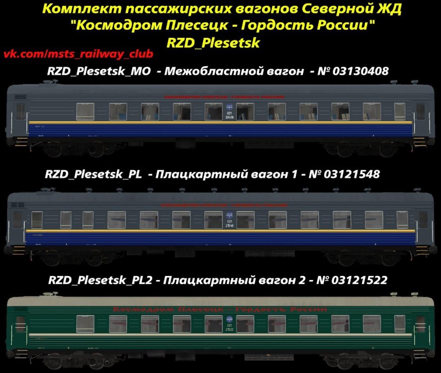Комплект пассажирских вагонов Северной ЖД "Космодром Плесецк - Гордость России" Версия 2.0 АВТОРЫ: Модели: Александр Федюнин (--RZD--) Виктор Михайлов (awaken) Техническая настройка: Виктор Михайлов (awaken) Алексей Алпатов (Aleks) Олег Водопьянов Текстуры: Александр Федюнин (--RZD--) Олег Водопьянов Перекраска: Олег Водопьянов Авторская идея: Олег Водопьянов В комплект входит 3 вагона: RZD_Plesetsk_MO - Межобластной вагон - № 03130408 "Космодром Плесецк - Гордость России" RZD_Plesetsk_PL - Плацкартный вагон 1 - № 03121548 "Космодром Плесецк - Гордость России" RZD_Plesetsk_PL2 - Плацкартный вагон 2 - № 03121522 "Космодром Плесецк - Гордость России" [Hidden Content]