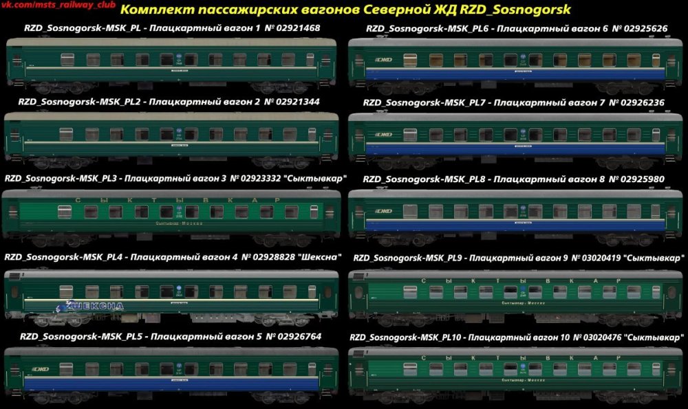 Комплект пассажирских вагонов Северной ЖД, для составов поездов: Сосногорск-Москва Сосногорск-Новороссийск Сосногорск—Троицко-Печорск Сыктывкар-Москва Сыктывкар—Усинск АВТОРЫ: Модели: Александр Федюнин (--RZD--) Виктор Михайлов (awaken) Техническая настройка: Виктор Михайлов (awaken) Алексей Алпатов (Aleks) Алексей Фёдоров (Im-Ho-Tep) Олег Водопьянов (Olegator_OS) Текстуры: Александр Федюнин (--RZD--) Олег Водопьянов (Olegator_OS) Перекраска: Олег Водопьянов (Olegator_OS) Авторская идея: Олег Водопьянов (Olegator_OS) В комплект входит 10 вагонов: RZD_Sosnogorsk-MSK_PL - Плацкартный вагон 1 № 02921468 RZD_Sosnogorsk-MSK_PL2 - Плацкартный вагон 2 № 02921344 RZD_Sosnogorsk-MSK_PL3 - Плацкартный вагон 3 № 02923332 "Сыктывкар" RZD_Sosnogorsk-MSK_PL4 - Плацкартный вагон 4 № 02928828 "Шексна" RZD_Sosnogorsk-MSK_PL5 - Плацкартный вагон 5 № 02926764 RZD_Sosnogorsk-MSK_PL6 - Плацкартный вагон 6 № 02925626 RZD_Sosnogorsk-MSK_PL7 - Плацкартный вагон 7 № 02926236 RZD_Sosnogorsk-MSK_PL8 - Плацкартный вагон 8 № 02925980 RZD_Sosnogorsk-MSK_PL9 - Плацкартный вагон 9 № 03020419 "Сыктывкар" RZD_Sosnogorsk-MSK_PL10 - Плацкартный вагон 10 № 03020476 "Сыктывкар" [Hidden Content]