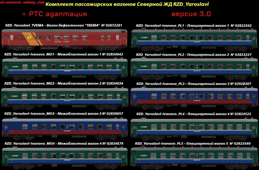 Комплект пассажирских вагонов Северной ЖД, для составов пригородных поездов: Ярославль-Иваново Ярославль-Рыбинск Иваново-Ковров Иваново-Кинешма Иваново-Александров Данилов-Буй Версия 3.0 (часть-1 межобластные и плацкартные вагоны + вагон "ТВЕМА") АВТОРЫ: Модели: Александр Федюнин (--RZD--) Виктор Михайлов (awaken) Техническая настройка: Виктор Михайлов (awaken) Алексей Алпатов (Aleks) Алексей Фёдоров (Im-Ho-Tep) Олег Водопьянов (Olegator_OS) Текстуры: Александр Федюнин (--RZD--) Олег Водопьянов (Olegator_OS) Перекраска: Олег Водопьянов (Olegator_OS) Авторская идея: Олег Водопьянов (Olegator_OS) Авторская адаптации под РТС: Игорь Дуванов aka NMSK [Hidden Content]