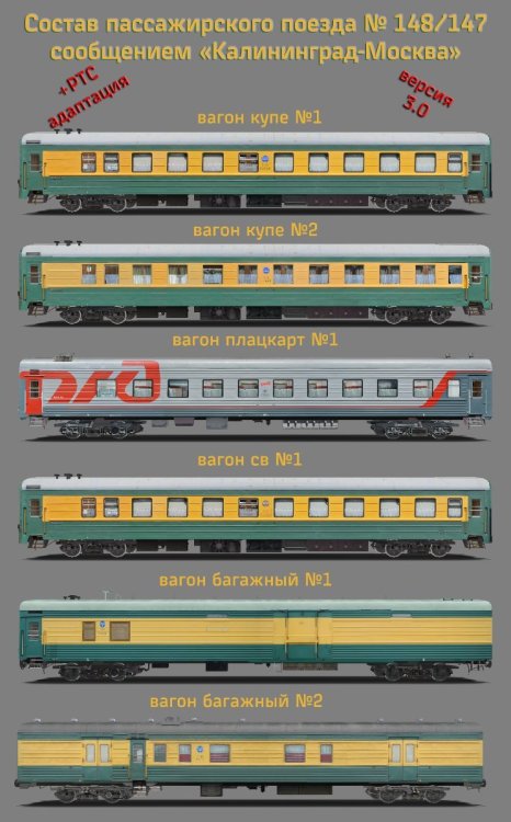 Состав пассажирского поезда № 148/147 сообщением «Калининград-Москва» Авторы: * Виктор Михайлов aka awaken, Федюнин Александр aka -–RZD-- - авторы модели * Виктор Михайлов aka awaken, Федюнин Александр aka -–RZD-- - авторы текстур, Михаил Кузнецов aka Mlazy * Виктор Михайлов aka awaken, Алексей Фёдоров aka Im-Ho-Tep, Федюнин Александр aka –-RZD-- – авторы технических настроек * Михаил Кузнецов aka Mlazy – автор перекраски * Denis– автор фотоматериала В пакет входят: - Пассажирский купейный вагон № 1 - Пассажирский купейный вагон № 2 - Пассажирский вагон СВ № 1 - Багажный вагон производства ТВЗ № 1 - Пассажирский плацкартный вагон производства КВЗ 54 места - Багажный вагон РЖД переоборудованный из почтового № 2 [Hidden Content]