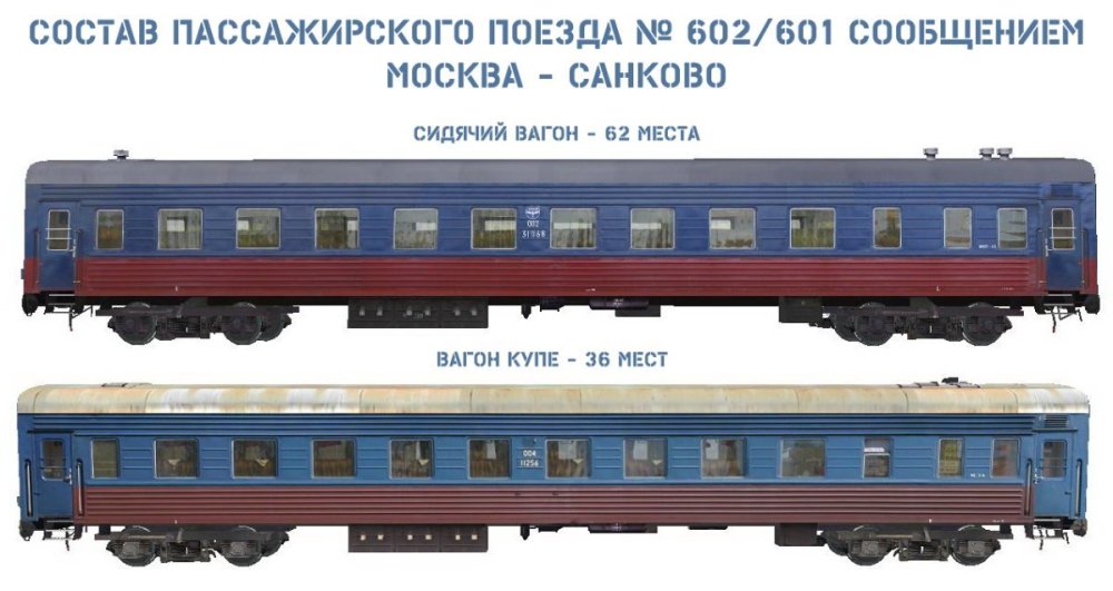 Состав пассажирского поезда № 602/601 Сообщением Москва - Санково Авторы: * Виктор Михайлов aka awaken, Федюнин Александр aka -–RZD-- - авторы модели * Виктор Михайлов aka awaken, Федюнин Александр aka -–RZD-- - авторы текстур * Виктор Михайлов aka awaken, Алексей Алпатов aka Aleks, Федюнин Александр aka –-RZD-- – авторы технических настроек * Михаил Кузнецов aka Mlazy- автор перекраски * Паштет - автор фотоматериала В состав входит: - Купейный вагон - Сидячий вагон [Hidden Content]
