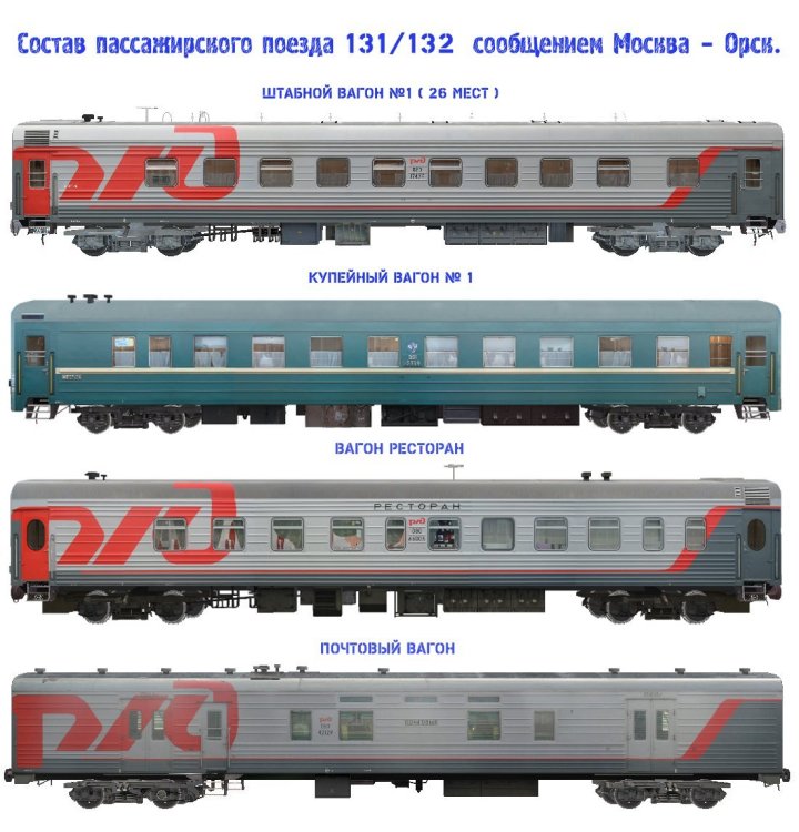 Состав пассажирского поезда 131/132 сообщением Москва – Орск. Авторы: * Виктор Михайлов aka awaken, Федюнин Александр aka -–RZD-- - авторы модели * Виктор Михайлов aka awaken, Федюнин Александр aka -–RZD-- - авторы текстур * Виктор Михайлов aka awaken, Алексей Алпатов aka Aleks, Федюнин Александр aka –-RZD-- – авторы технических настроек * Кузнецов Михаил aka mlazy – автор перекраски * Федюнин Александр aka –-RZD-- автор фотоматериала * Максим Рязанов (с) aka limburg55 В состав входят: * Вагон купе № 1 (аммендорф) * Штабной вагон ТВЗ № 1 * Вагон ресторан модель 61-536.1.002 * Почтовый вагон [Hidden Content]