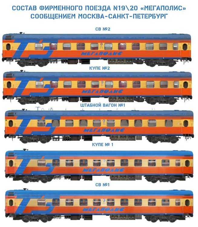 Состав фирменного частного поезда N19\20 «Мегаполис» сообщением Москва - Санкт - Петербург Авторы: * Виктор Михайлов aka awaken, Федюнин Александр aka -–RZD-- - авторы модели * Виктор Михайлов aka awaken, Федюнин Александр aka -–RZD-- - авторы текстур * Виктор Михайлов aka awaken, Алексей Алпатов aka Aleks, Федюнин Александр aka –-RZD-- – авторы технических настроек * Кузнецов Михаил aka Mlazy – авторы перекраски * Бабанов Донат aka Donat – автор фотоматериала В пакет входят: - Пассажирский купейный вагон № 1 ТВЗ - Пассажирский вагон СВ № 1 ТВЗ - Пассажирский купейный вагон № 2 ТВЗ - Пассажирский вагон СВ № 2 ТВЗ - Пассажирский штабной купейный вагон № 1 ТВЗ [Hidden Content]