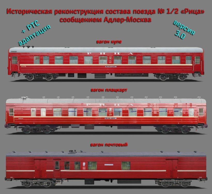 Историческая реконструкция состава поезда № 1/2 «Рица» сообщением Адлер-Москва 5 мая 1964 года. Первый рейс поезда 7/8 "Рица" Москва - Адлер. Маршрут проходил ч-з Харьков, Ростов, Армавир. 1965/66г. Номер поезда 1/2. Семидесятые-восьмидесятые годы. Раскрас вагонов: цвет красный (с надписью: "Рица"). 1983 год, поезд последний раз идёт ч-з Армавир, начиная с 1984г, Рица курсирует по новому участку ч-з Краснодар, Горячий ключ. 1988/89г. Название поезда сменяется с Рица на Сочи. Расцвет вагонов заменяют на зелёные с синей полосой. Авторы: * Виктор Михайлов aka awaken, Федюнин Александр aka -–RZD-- - авторы модели * Виктор Михайлов aka awaken, Федюнин Александр aka -–RZD-- - авторы текстур * Виктор Михайлов aka awaken, Алексей Алпатов aka Aleks, Федюнин Александр aka –-RZD-- – авторы технических настроек * Михаил Кузнецов aka Mlazy – автор перекраски * Максим Рязанов aka Limburg 55 –Вадим Литвинович aka WALT авторы фотоматериала *Игорь Дуванов aka NMSK – автор адаптации под РТС В пакет входят: - Пассажирский купейный вагон № 1 - Пассажирский плацкартный вагон № 1 - Пассажирский почтовый вагон № 1 [Hidden Content]