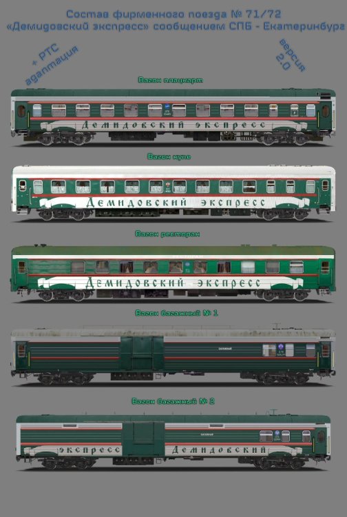 Состав фирменного поезда № 71/72 «Демидовский экспресс» сообщением СПБ - Екатеринбург. Авторы: * Виктор Михайлов aka awaken, Федюнин Александр aka -–RZD--; Сергей Ермоленко aka св_вл8; Слава Усов aka Slavau; Роман Власюк aka RoM - авторы модели * Виктор Михайлов aka awaken, Федюнин Александр aka -–RZD-- - авторы текстур * Виктор Михайлов aka awaken, Алексей Алпатов aka Aleks, Федюнин Александр aka –-RZD-- – авторы технических настроек * aka Alex19 – автор перекраски и текстур для TRAINZ * aka INDRIKIS – автор перекладки текстур из TRAINZ * Игорь Дуванов aka NMSK – автор адаптации под РТС * Михаил Кузнецов aka Mlazy – автор перекраски В пакет входит: - Багажный вагон № 1 - Багажный вагон № 2 - Пассажирский плацкартный вагон № 1 - Пассажирский купейный вагон № 1 - Вагон ресторан [Hidden Content]