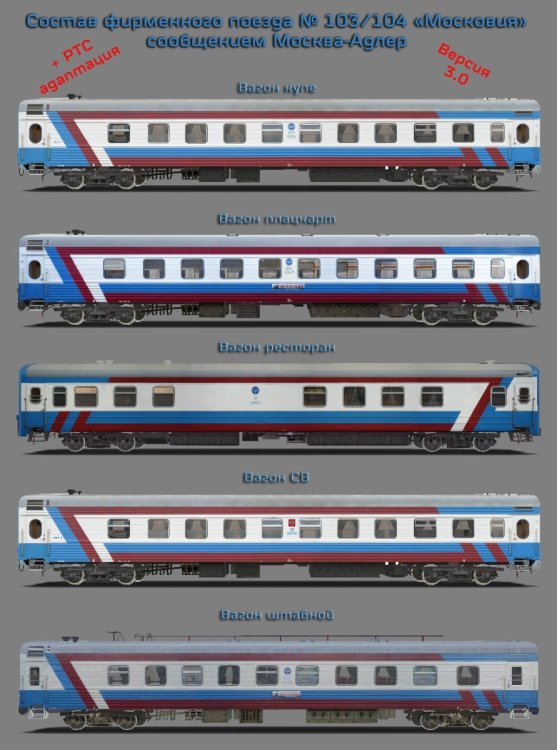Состав фирменного поезда № 103/104 «Московия» сообщением Москва-Адлер Авторы: * Виктор Михайлов aka awaken, Федюнин Александр aka -–RZD-- - авторы модели * Виктор Михайлов aka awaken, Федюнин Александр aka -–RZD-- - авторы текстур * Виктор Михайлов aka awaken, Алексей Алпатов aka Aleks, Федюнин Александр aka –-RZD-- – авторы технических настроек * Михаил Кузнецов aka Mlazy – автор перекраски * Кузнецов Михаил aka mlazy – автор фотоматериала * Максим Рязанов aka Limburg 55 – автор фотоматериала В пакет входят: - Пассажирский плацкартный вагон № 1 производства ТВЗ 54 места - Пассажирский штабной вагон марки ТВЗ3 - Вагон ресторан - Пассажирский купейный вагон производства ТВЗ 36 мест - Пассажирский вагон СВ производства ТВЗ 18 мест [Hidden Content]